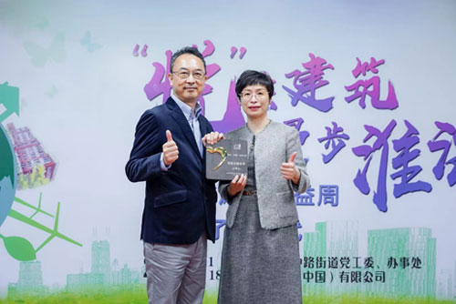 索尼中国被授予“社区公益企业”荣誉称号,左为伊东祐先生,右为陆晓钧书记。